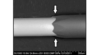 被覆の除去際は、潰れず上図のような傾斜形状となります。後工程への影響を極力少なくすることができます。
