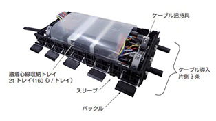 ケーブルのスロットのみを切断し、光ファイバ心線は切断せずに通過心線収納トレイに収納し、必要な心数のみを分岐ケーブルと接続します。